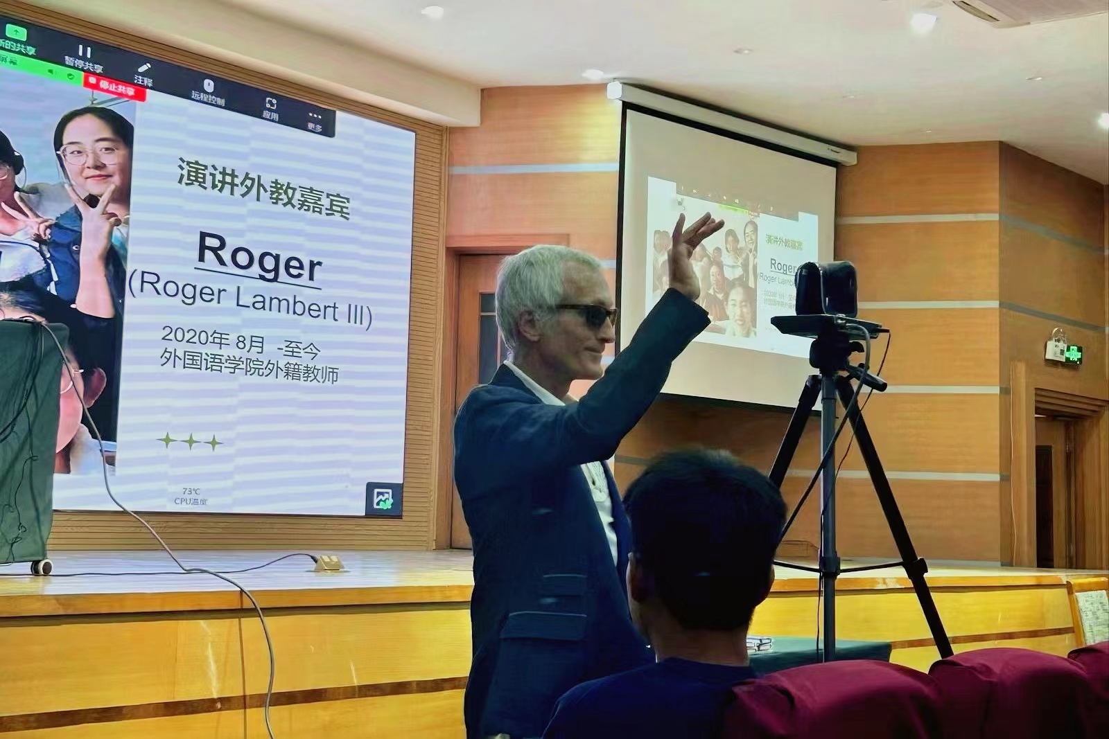 外国语学院美籍教师Roger谈起他从美国到韩国再到中国的心路历程。他品尝到中国美食、享受到中国便利的支付方式,并且感受到中国人的友好和给予他家一般的温暖。他鼓励同学们去尝试挑战自我,不要被金钱和恐惧所束缚。
