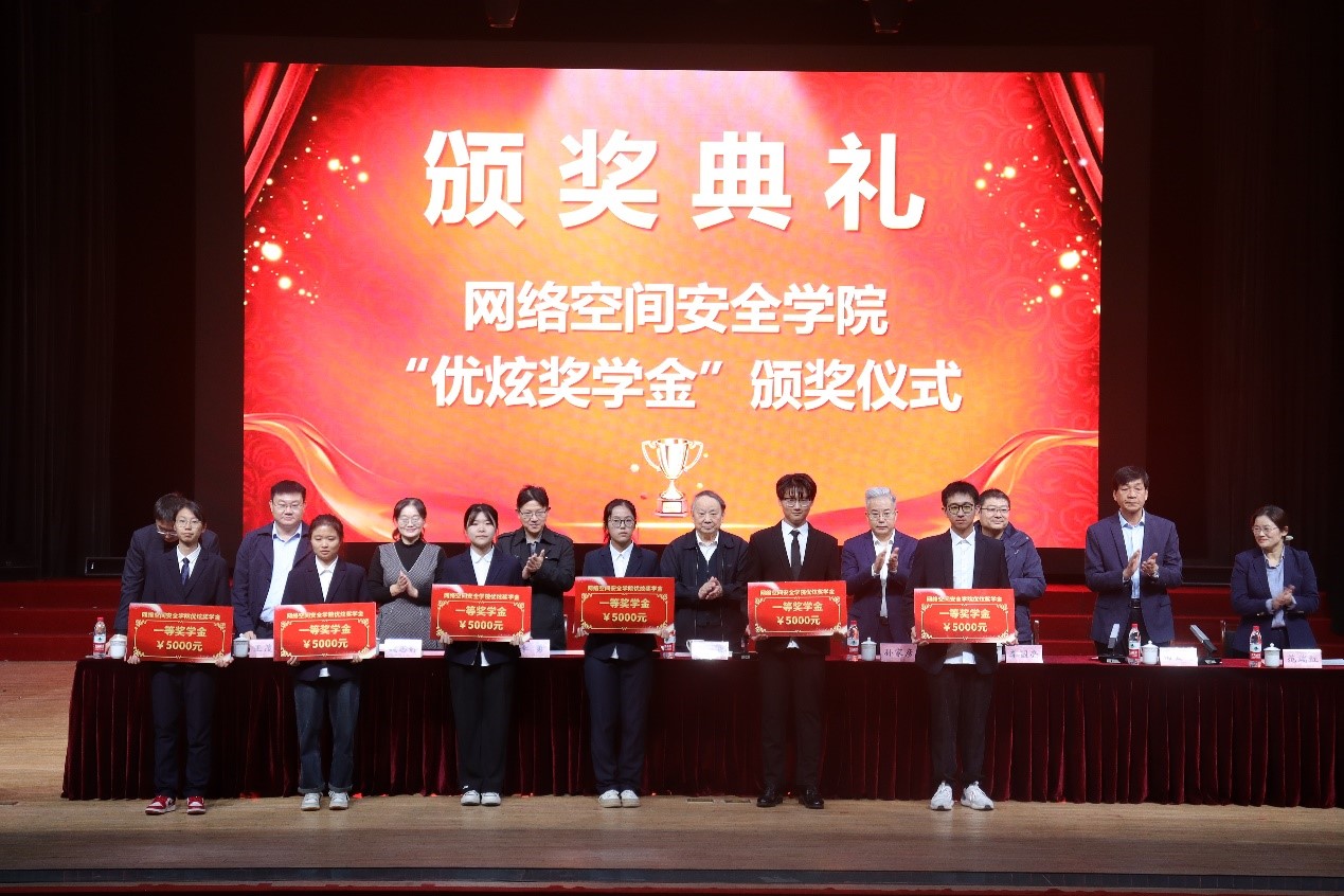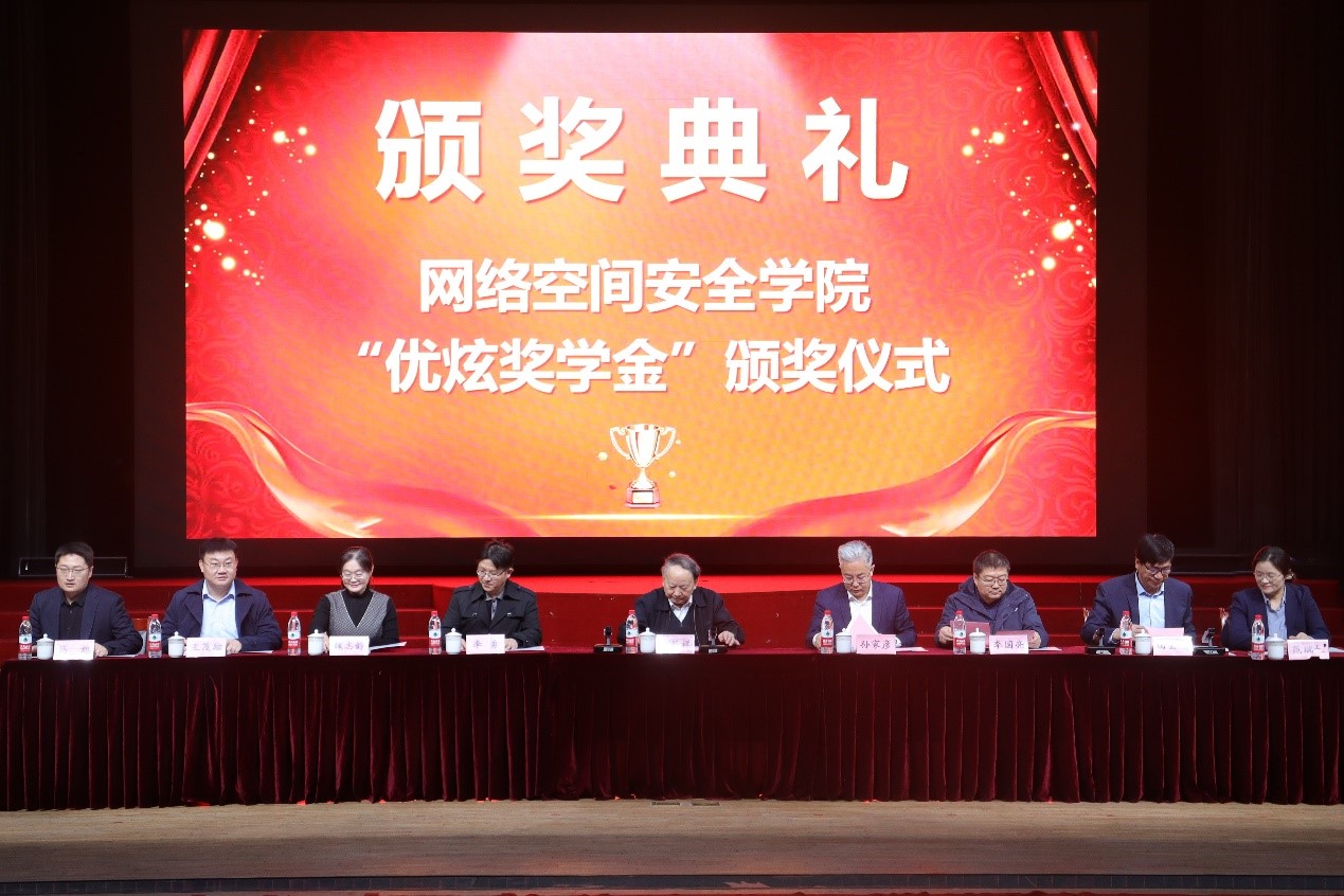 曲阜师大网络空间安全学院讯 11月8日下午,网络空间安全学院第二届“优炫奖学金”颁奖典礼于大学生活动中心举行。中国工程院院士、教育部高等学校网络安全专业教学指导委员会名誉主任、万象城手机网页版登录入口特聘教授沈昌祥,北京优炫软件股份有限公司首席运营官孙家彦,北京优炫软件股份有限公司研发总经理李勇,北京知道创宇信息技术股份有限公司副总裁李国亮,济宁市委网信办副主任魏志静,网络空间安全学院党委书记田云飞、院长王茂励、党委副书记范瑞红、副院长马旭以及全体辅导员出席颁奖典礼,2022级、2023级全体学生参加活动。活动由田云飞主持。