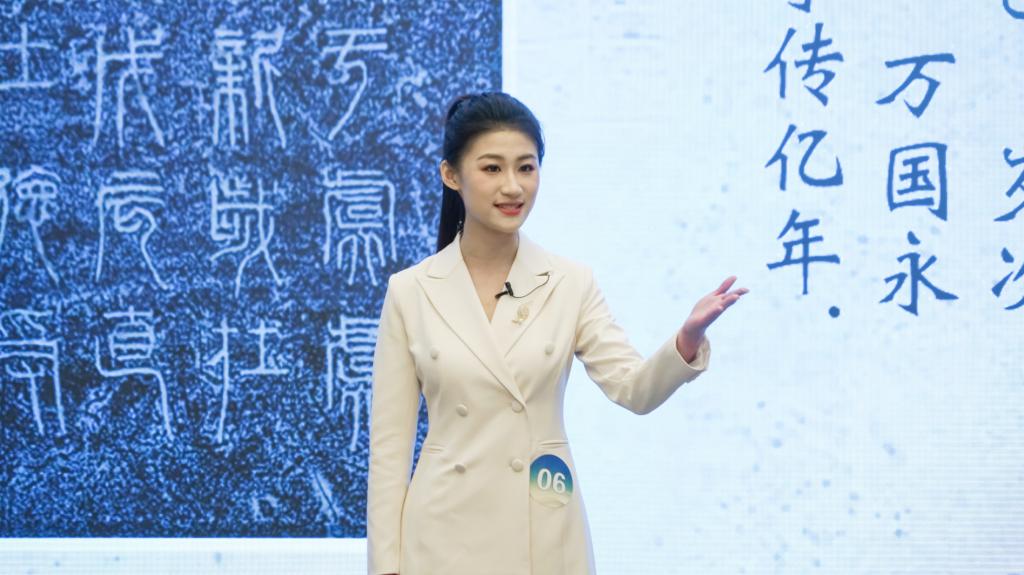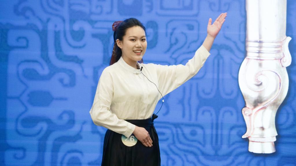 王葆嘉以《“诏”行天下》为题,深度挖掘新莽铜诏版的内涵。在备赛环节精心准备,仔细打磨讲解稿,反复排练预演,积极向老师同学取经。在比赛现场,王葆嘉以细致的语言、精巧的构思和表现力向观众全面展示了新莽铜诏版背后蕴含的“国家统一、民族团结、永享太平”的价值追求。一句“‘诏’行天下,走过的是山河,连起的是中国!”更是赢得了现场评委和观众的热烈掌声。