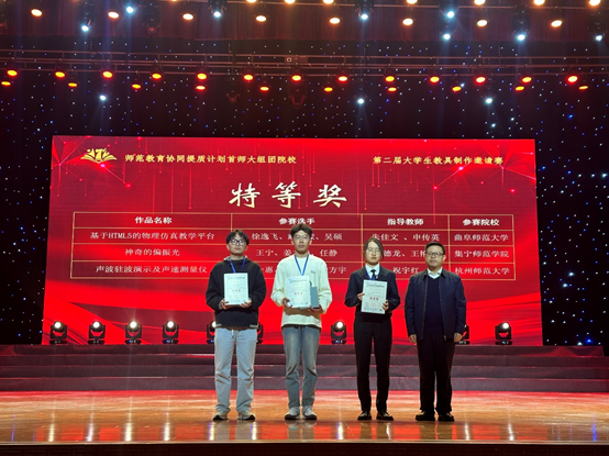 比赛分为校赛、组团初赛和组团复赛三个环节。校赛环节,各学院广泛宣传、积极动员,共提交教具作品62件。经过7所院校的层层选拔,曲阜师大共有30件作品进入初赛,最终10件作品入围复赛。复赛共评出特等奖3项,一等奖6项,二等奖10项,三等奖13项。曲阜师大物理工程学院学生徐逸飞、臧雨濛、吴硕的电子与信息类教具作品《基于HTML5的物理仿真教学平台》荣获特等奖,物理工程学院学生李鑫、谭明悦、孙文扬的实物教具作品《看得见的声音》荣获一等奖,物理工程学院学生王竟祺、李梓萱、董金帅的电子与信息类教具作品《基于ESP32的PID算法演示教具》荣获三等奖,数学与科学学院学生吴丰耘、郑艺昕的实物教具作品《立体几何抽绳教具》荣获三等奖。其中,荣获特等奖的2022级物理学(师范)专业学生徐逸飞作为参赛选手代表进行了现场展示。