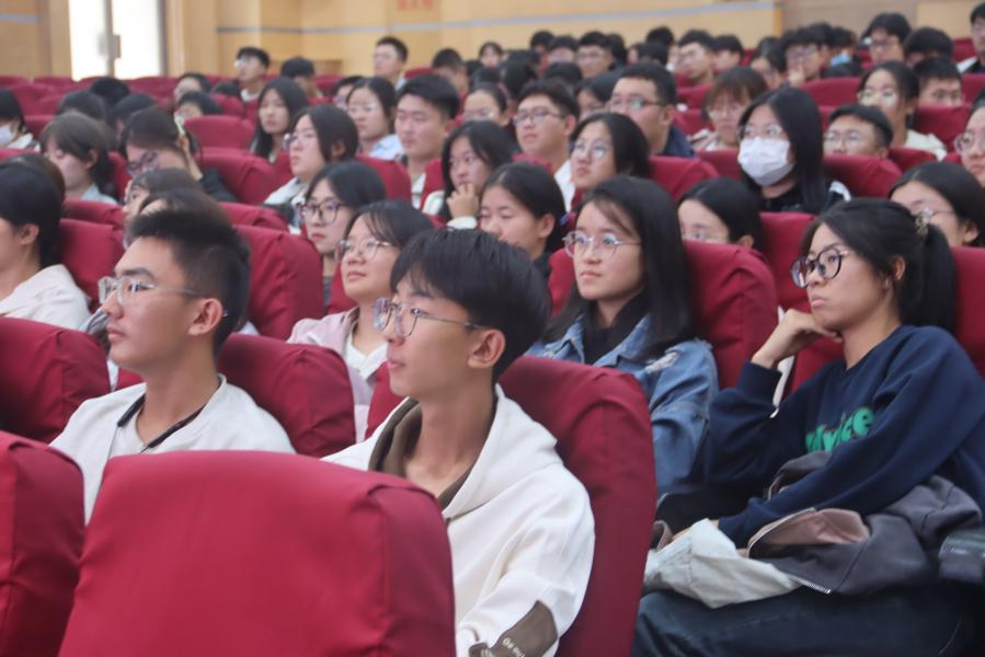 冯媛媛回顾了学校和学院的发展历程及办学成就,向同学们展示了优秀毕业生代表的风采。在分享交流环节,冯媛媛向同学们讲述了杰出校友的成功事迹,引导同学们在学习的道路上持之以恒,并鼓励同学们在学习中发现乐趣,探索未知。最后,她希望大家坚定理想信念,胸怀“国之大者“;夯实专业基础,锤炼学习能力;磨练意志品格,坚定勇毅前行。