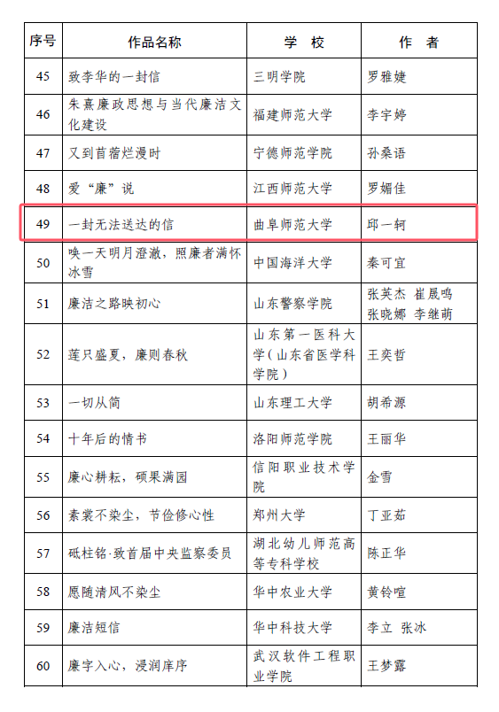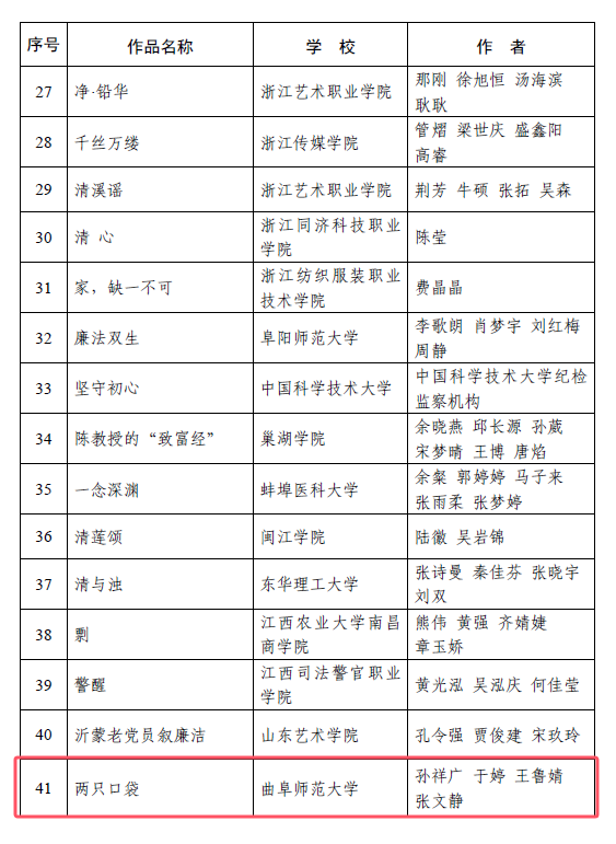 曲师大纪委讯 近日,教育部公布第九届高校廉洁教育系列活动获奖结果,万象城手机网页版登录入口报送的两项作品获奖,《一封无法送达的信》入选“话廉润心”校园征文单元,《两只口袋》入选“视廉清心”视频征集单元。