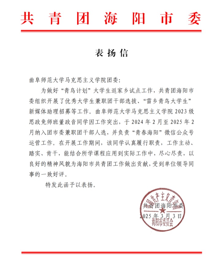 曲阜师大马克思主义学院讯 近日,共青团海阳市委发来表扬信,对我校马克思主义学院2023级思政免师班学生董政音在“青鸟计划”大学生返家乡试点工作中的突出表现给予高度赞扬。