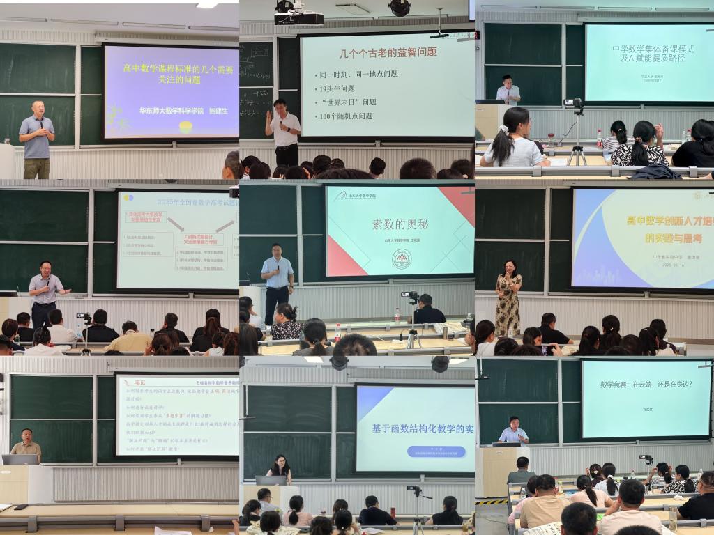 本次培训为期六天,依托学校数学学科优势,创新采用初、高中分组授课模式,实现学段精准覆盖。培训邀请人民教育出版社张劲松编审、华东师范大学鲍建生教授、宁波大学邵光华教授、山东大学王明强教授、青岛教科院李现勇教授等国内数学教育界权威专家,与学院师资团队协同授课。围绕“教材与课标解读”“核心素养与课程改革”“信息化手段赋能数学教学”“命题技术与评价体系构建”“竞赛数学辅导策略”“教研论文撰写方法”等专题,开展系列讲座。课程内容体系完整,兼具理论深度与实践指导性,为参训教师提供了从教育理念到课堂方法的全方位赋能。