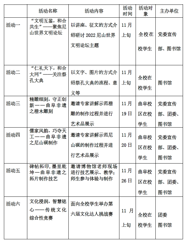 为践行习近平总书记视察曲阜重要讲话9周年,更好弘扬中华优秀传统文化,图书馆本届传统文化月以此为契机举办“走近尼山文明,感受非遗之美”主题系列活动,旨在让同学们近距离感受儒家传统文化的魅力,理解和平、发展、公平、正义、民主、自由的全人类共同价值,挖掘其中蕴含的和而不同等中华优秀传统文化理念,通过交流互鉴,致力于为人类文明进步注入新的力量。