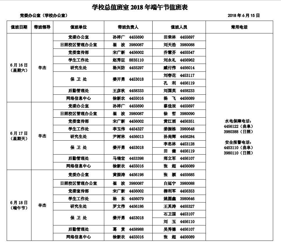 学校总值班室2018年端午节值班表