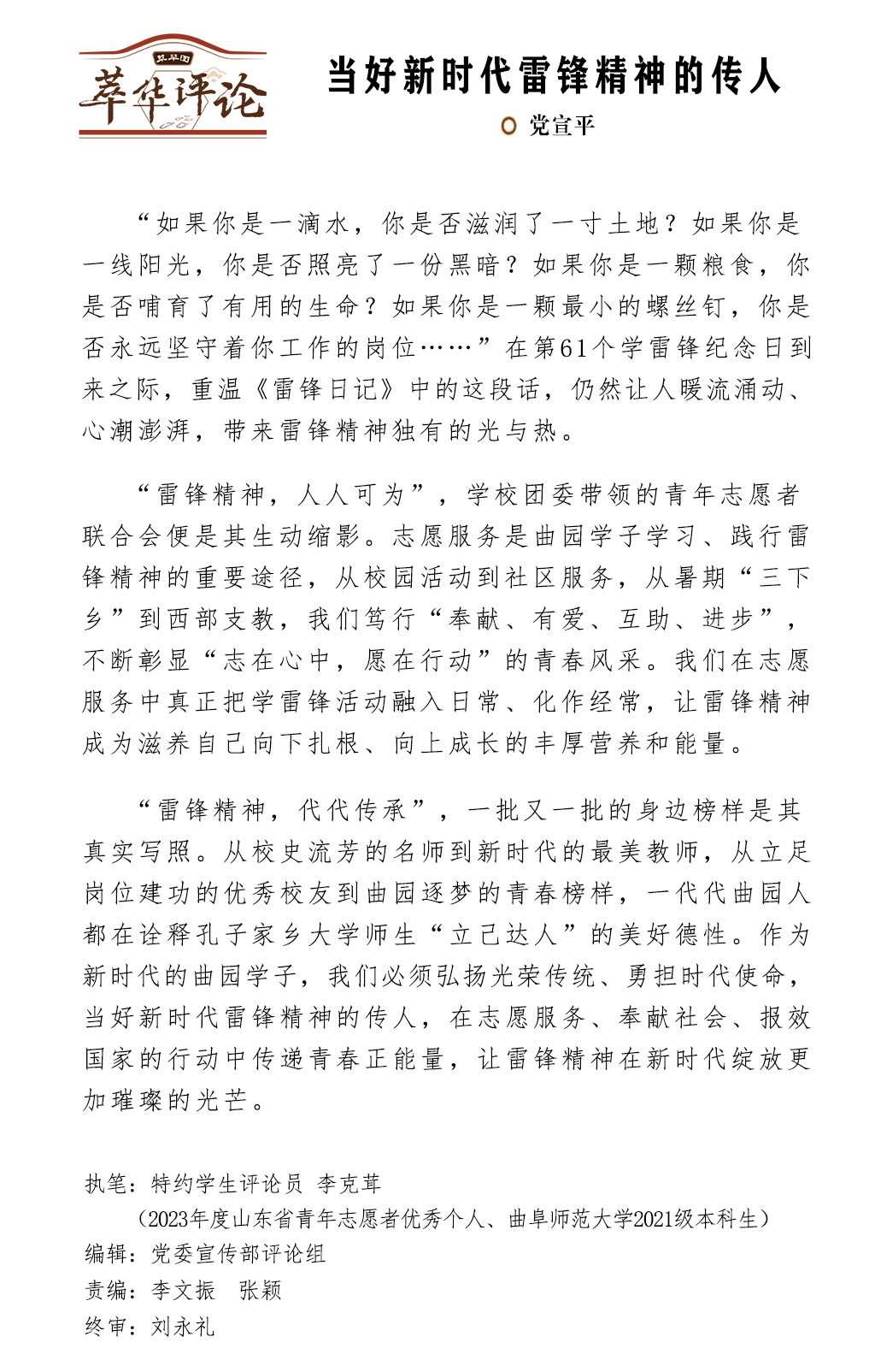 【萃华评论】当好新时代雷锋精神的传人