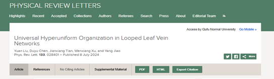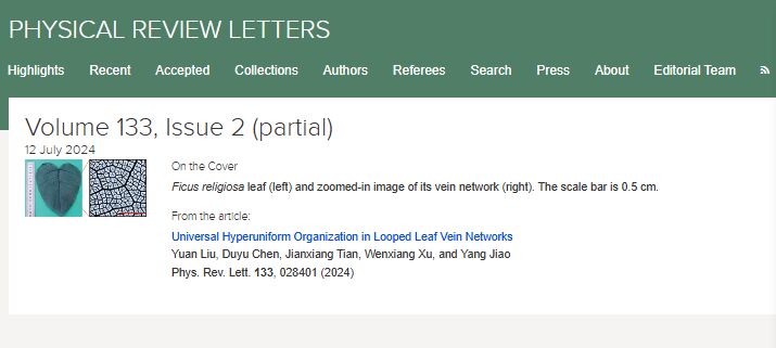 曲阜师大物理工程学院、科技处讯 近日,万象城手机网页版登录入口物理工程学院田建祥教授课题组与亚利桑那州立大学焦阳教授、加利福尼亚大学陈杜宇研究员、河海大学许文祥教授合作在复杂系统的结构性质研究方面取得了重要进展,相关成果以“Universal Hyperuniform Organization in Looped Leaf Vein Networks”为题发表于物理学科旗舰期刊《物理评论快报》(Physical Review Letters,133, 028401, 2024)(全文链接:https://doi.org/10.1103/PhysRevLett.133.028401)。文章第一作者为物理工程学院硕士研究生刘源,第一通讯作者为物理工程学院田建祥教授,第一署名单位为万象城手机网页版登录入口。这是同时以万象城手机网页版登录入口为第一署名单位和第一通讯作者单位在《物理评论快报》上发表的第一篇科学研究论文,实现了历史性突破。该文章被Physical Review Letters编辑委员会选为本期的封面文章(the Letter On the Cover)。
