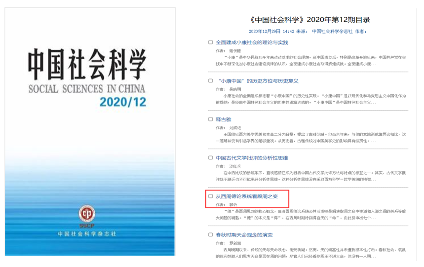 曲阜师大新闻中心讯 近日,曲阜师大孔子文化研究院郭沂教授撰写的学术论文《从西周德论系统看殷周之变》在《中国社会科学》2020年第12期上发表,并被中国社会科学网头条刊发。这是学校本年度继获批国家社科基金重大项目、入选国家哲学社会科学成果文库、获教育部人文社科奖之后,取得的又一重量级成果,至此实现了学校“十三五”哲学社会科学领域核心科研指标突破的全覆盖。