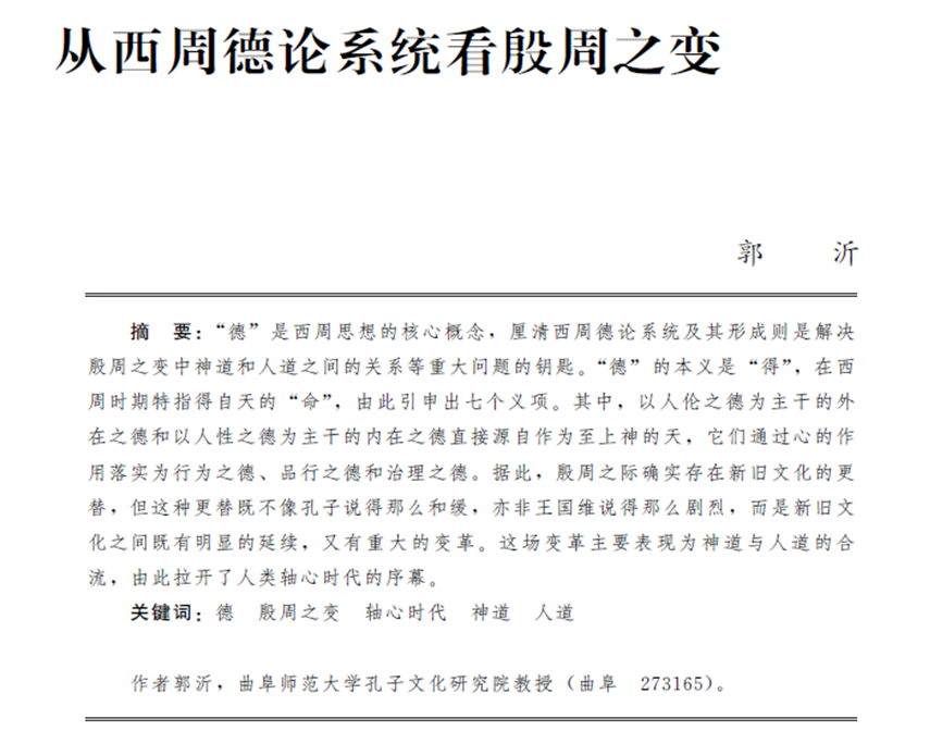 殷周之际是中国传统文化形成的关键时期,而殷周之变的形式和性质却是中国学术思想史上一个聚讼纷纭的重大问题。郭沂教授的论文以殷周之变为研究对象,提出“德”是西周思想的核心概念,厘清西周德论系统及其形成则是解决殷周之变中神道和人道之间的关系等重大问题的钥匙。“德”的本义是“得”,在西周时期特指得自天的“命”,由此引申出七个义项。在此研究基础上,郭沂教授还对中国学术思想史上若干重大问题提出了自己的见解,“中国哲学在殷周之际已经形成”、“中国的轴心时代始于殷周之际,迄于周秦之际,春秋、战国时期只是一个新的高潮,这意味着人类轴心时代早在公元前十一世纪就已经拉开了序幕,并非始于公元前800年。”
