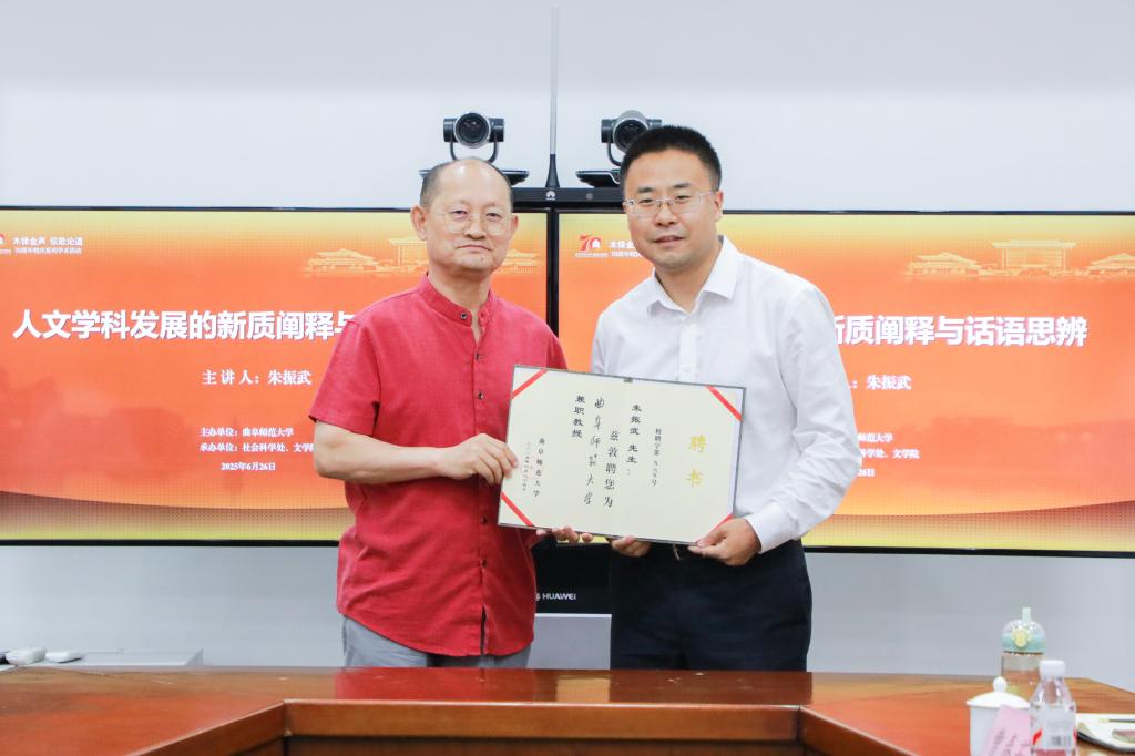 文学院、社会科学处讯 6月26日,上海师范大学外国文学研究中心主任朱振武教授来校作学术报告并受聘曲阜师大兼职教授,曲阜师大党委常委、副校长李登旺出席报告会并为朱振武教授颁发聘书。朱振武教授在报...